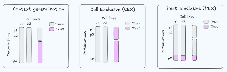 A more practically useful evaluation is cell-exclusive generalization (CEX, Fig. 1. mid.)—holding out cellular contexts and asking whether a model can predict how the same perturbation behaves across cell types, including selectivity patterns. Unfortunately, CEX is underrepresented in current Perturb-seq benchmarks, making it difficult to test stronger claims about real-world Target ID workflows.