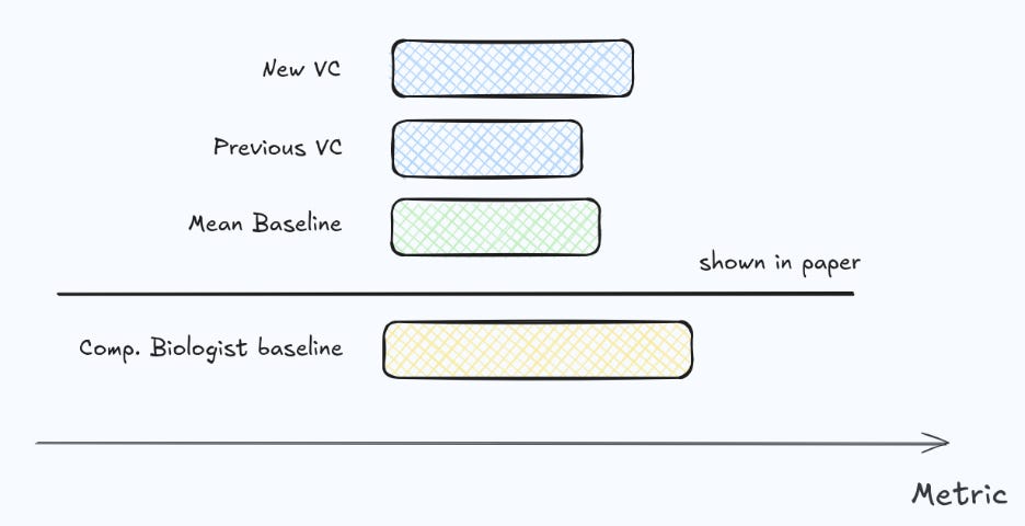 It is encouraging that reporting simple baselines on perturbation benchmarks is becoming standard practice. Still, we often find that baselining is not yet rigorous enough: there is a large space between trivial baselines and the most complex Virtual Cells, and that middle ground is frequently underexplored. In our own evaluations, investing effort into this “computational biologist baseline” space often closes much of the apparent gap to SOTA—and not so rarely matches or outperforms it—changing the conclusion about whether a complex Virtual Cell is worth deploying.