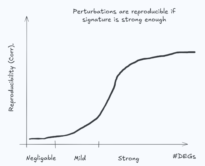 Correlation in differential expression space can be useful—but only when the perturbation induces a reproducible, sufficiently strong signature. If the true effect is near zero, the measured differential expression is dominated by noise and won’t reliably reproduce in the lab (Fig. 4). It is unrealistic (and undesirable) to expect a model to match such examples. This is not a corner case: many genetic perturbations have weak transcriptomic effects, and many drug–cell–dose combinations produce negligible response. In these regimes, correlation becomes unstable and can penalize sensible behavior while rewarding overfitting or noise chasing.