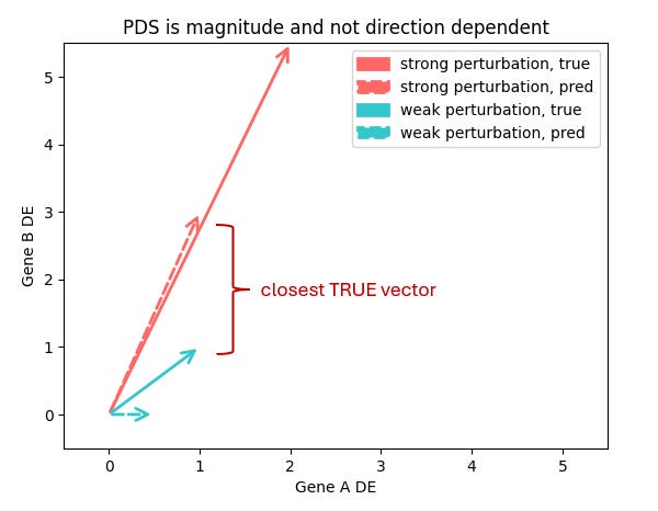 Trying to do all this in 20,000 dimensions amplify these issues. The core VCC metric PDS (Perturbation Discrimination Score) ranks which true perturbation vector your prediction is closest to. But what does “closest” really mean?