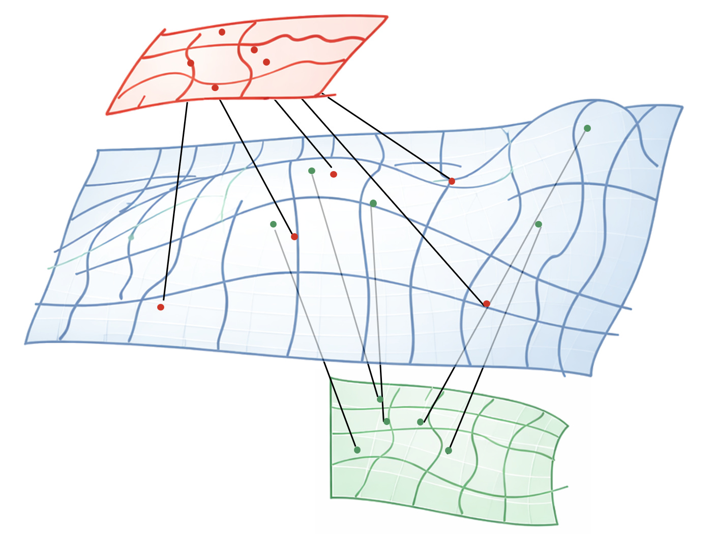 But to do that, you need to learn which regions of the green space are close to which regions of the red space in the original blue space.